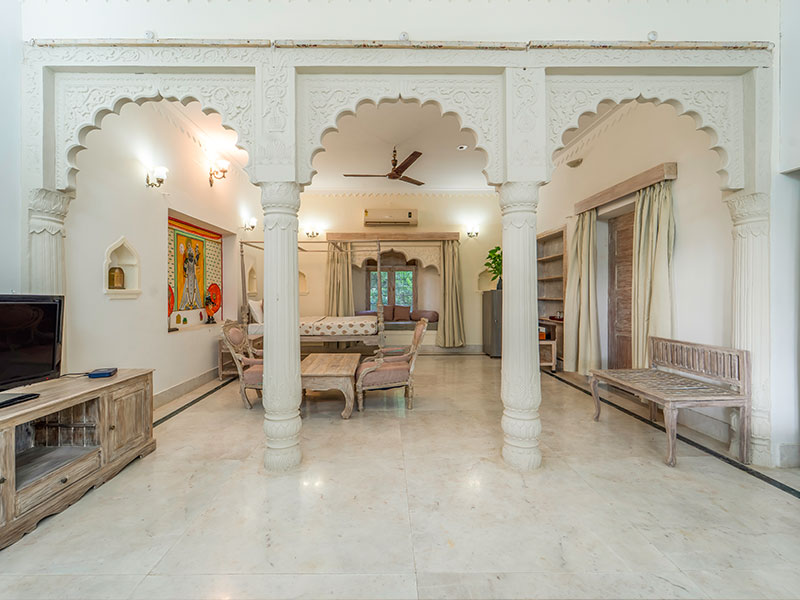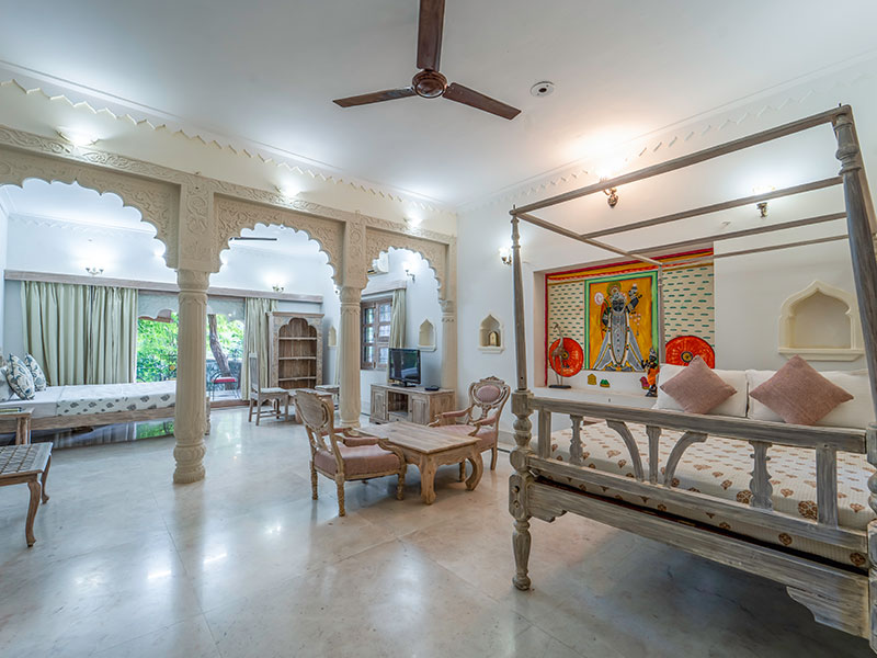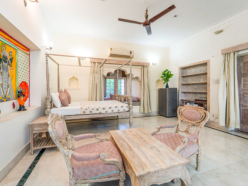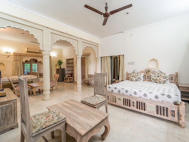 With two full-size double beds, cozy sitting areas, and a generous layout, these rooms offer an ideal solution for families or small groups who want to stay together while enjoying privacy and luxury. The architectural design reflects the regal vibe of Rajasthan with jharokhas, carved pillars, and handwoven furnishings that tell stories of local art and craftsmanship.